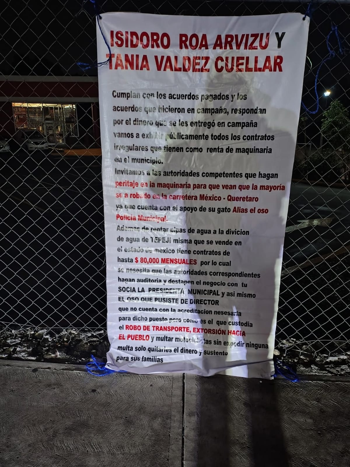 La madrugada de ayer en el municipio de Tepeji del Río, aparecieron cuatro mantas atribuidas a un presunto grupo delictivo y dirigidas a la alcaldesa Tania Valdéz. Una de ellas, fue colocada en una patrulla de la policía municipal, cuyo agente fue golpeado, esposado y baleado por los agresores.
