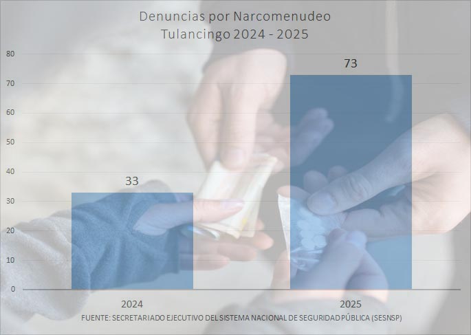 Las denuncias por el delito de narcomenudeo en Tulancingo, se incrementaron en más del 100 por ciento, durante el 2025, en comparación con el año 2024, de acuerdo con las cifras del Secretariado Ejecutivo del Sistema Nacional de Seguridad Pública (SESNSP).