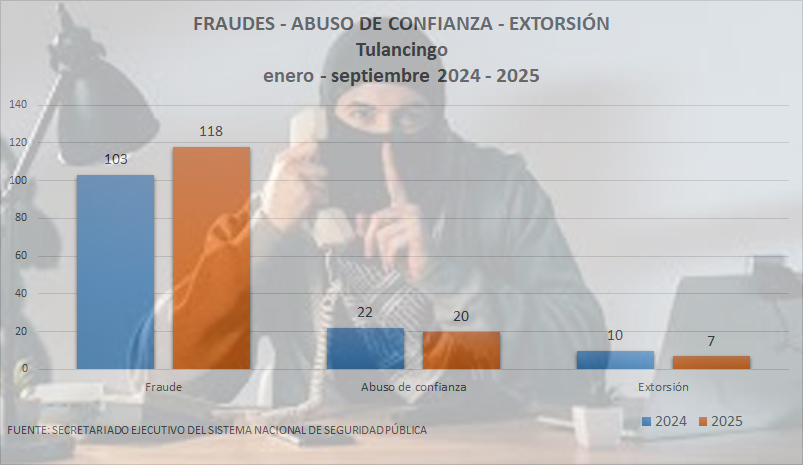 Las denuncias ante el Ministerio Público, por los delitos de Fraude, Extorsión y Abuso de Confianza, registran un aumento del 8 por ciento al comparar los registros del Secretariado Ejecutivo del Sistema Nacional de Seguridad Pública (SESNSP), correspondientes a enero – septiembre del 2024 y 2025.