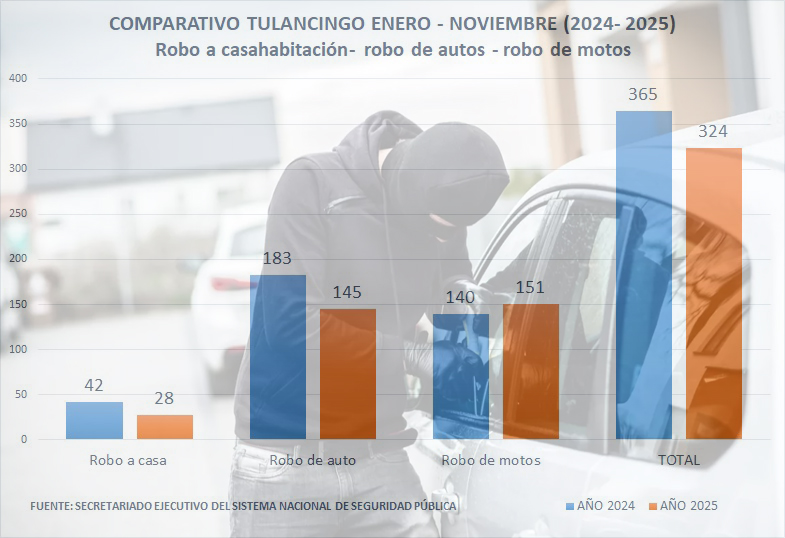 Las denuncias realizadas ante el Ministerio Público por los delitos de robo a casa habitación, robo de autos y robo de motos, descendieron un 11 por ciento en Tulancingo, en el periodo enero a noviembre del 2025, en comparación con el mismo periodo, pero del 2024, según el Secretariado Ejecutivo del Sistema Nacional de Seguridad Pública (SESNSP).
