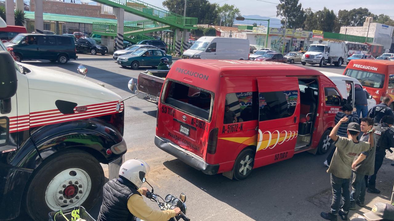 Con el choque, la colectiva impactó al tercer vehículo; una camioneta de carga, color blanco, de la marca Renault, con placas del estado de Hidalgo, y esta a su vez, impactó a otra colectiva de la misma ruta.
