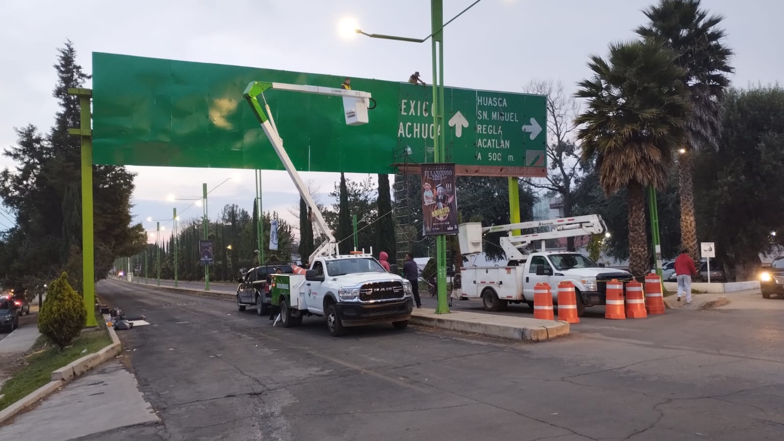 La estructura metálica, es la que está en la carretera Pachuca – Tuxpan, en la zona del Crucero Acatlán, la cual, debido a la construcción del distribuidor vial, quedó obsoleta, por lo que se decidió darle uso para colocar la nueva nomenclatura del mencionado bulevar.