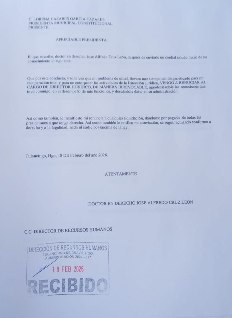 Tulancingo, Hgo.— José Alfredo Cruz León confirmó su renuncia irrevocable al cargo de Director Jurídico del gobierno municipal de Tulancingo, puesto que ocupaba desde noviembre pasado.