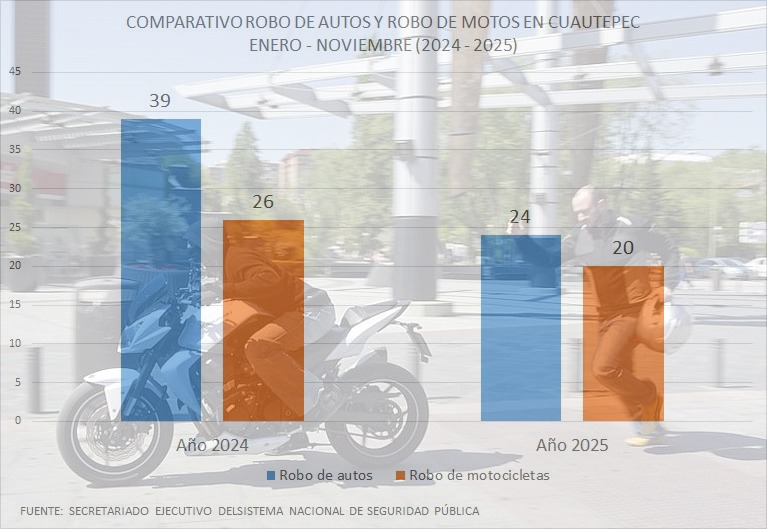 Las denuncias ante el agente del Ministerio Público por los delitos de robo de autos y robo de motocicletas en Cuautepec de Hinojosa han ido a la baja, al comparar los periodos enero – noviembre 2025 con el 2024, de acuerdo a las cifras del Secretariado Ejecutivo del Sistema Nacional de Seguridad Pública (SESNSP).De acuerdo a las cifras del ente federal, las cuales se basan en las denuncias que las víctimas interponen ante el agente del Ministerio Publico, pasaron de 65 de enero a noviembre 2024 a 44 querellas en el mismo periodo, pero del presente año, lo que representa una disminución del 32 por ciento.En el desglose de los datos, el robo de autos en el 2024, en el periodo señalado, registró 39 querellas, por 24 que se registraron en los 11 meses que han trascurrido en el presente año; en tanto que el robo de motocicletas pasó de 26 denuncias formales de enero a noviembre del 2024, a 20 en el mismo periodo, pero del presente año.Respecto al uso de actos violentos en la comisión de los robos, los datos del SESNSP indican que, de los 24 robos de autos, cinco fueron con lujo de violencia y 19 sin actos violentos, de acuerdo a lo declarado en las denuncias por parte de las víctimas.En el caso del robo de motocicletas, de las 20 denuncias, en cinco de ellas, las victimas señalaron que los hurtos se realizaron con lujo de violencia y 15 sin ella.