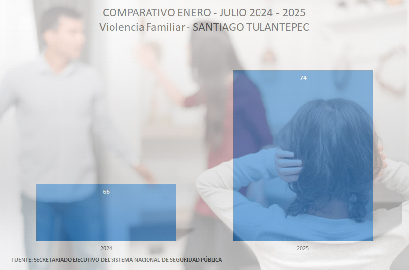 Las denuncias por el delito de violencia familiar, en Santiago Tulantepec, se incrementaron durante este año en un 12 por ciento, en comparación al año anterior, de acuerdo a las cifras del Secretariado Ejecutivo del Sistema Nacional de Seguridad Pública (SESNSP).