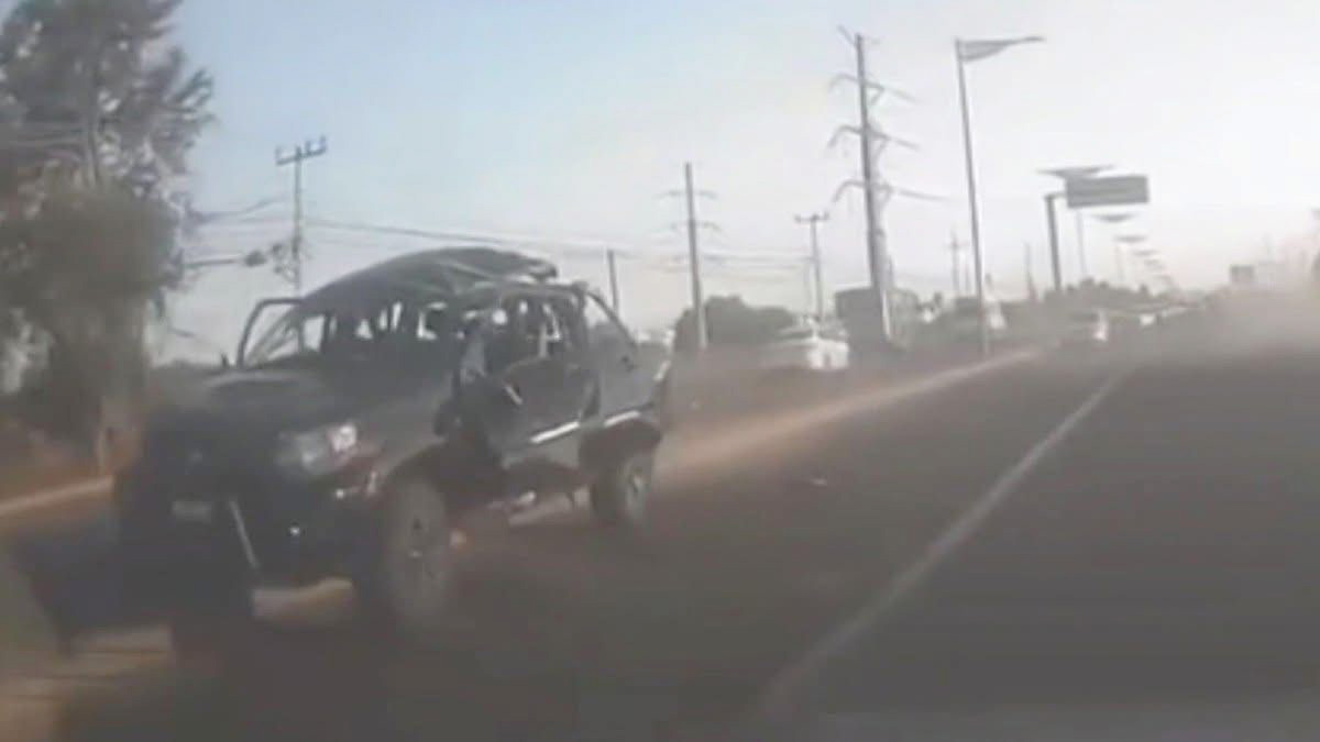 En un video que circula en redes, se observa cuando la unidad tras la explosión, queda a la deriva, zigzaguea de un carril a otro, hasta que se brinca el camaleón y detiene su loca carrera en un montículo de tierra.