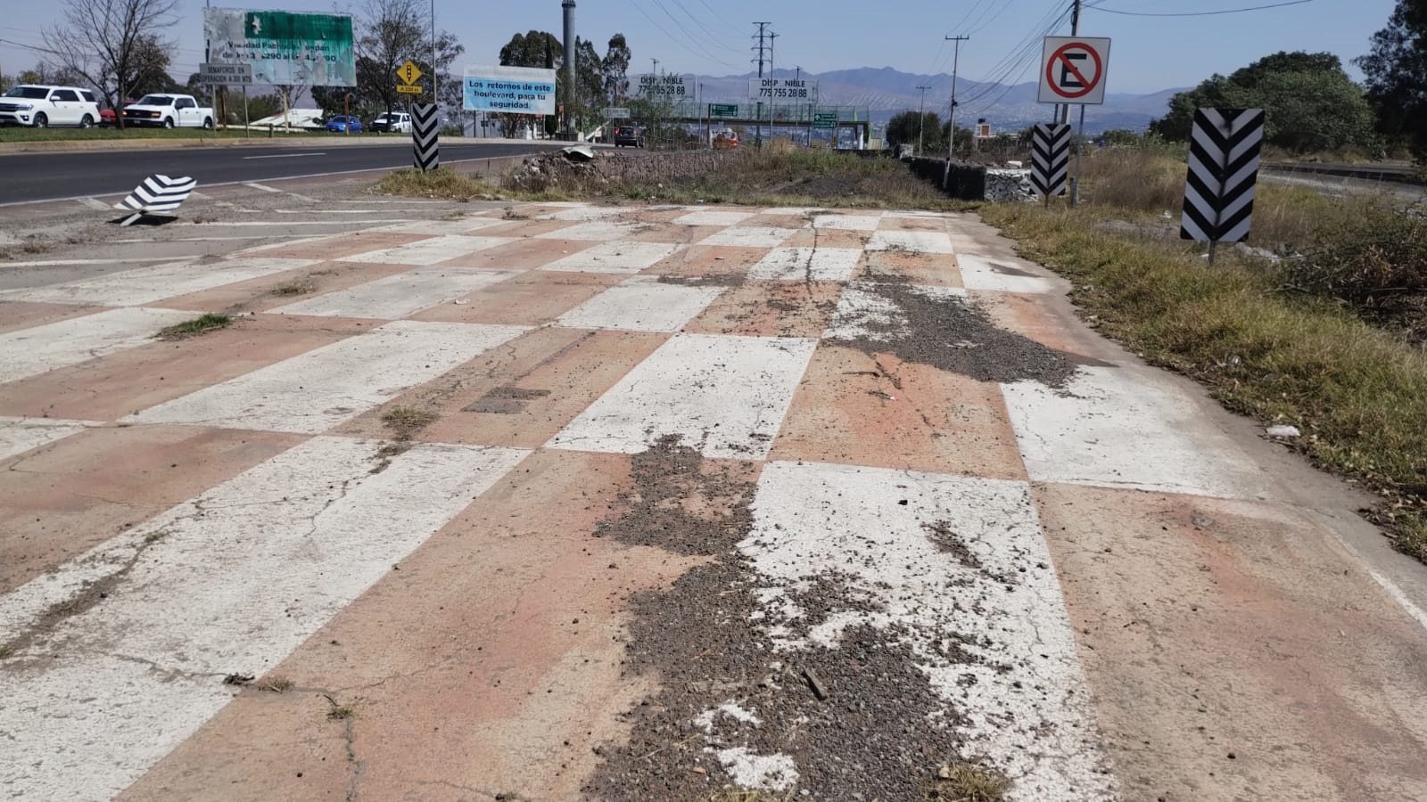 Además, la entrada a la rampa está con tres señalamientos dañados, al parecer por accidentes y el gavión, en la parte inicial, está debilitado por un golpe de una unidad pesada, e incluso se puede ver aún una salpicadera de un camión.