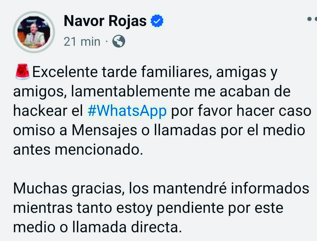 “Excelente tarde familiares, amigas y amigos, lamentablemente me acaban de hackear el #WhatsApp, por favor hacer caso omiso a mensajes o llamadas por el medio antes mencionado”.