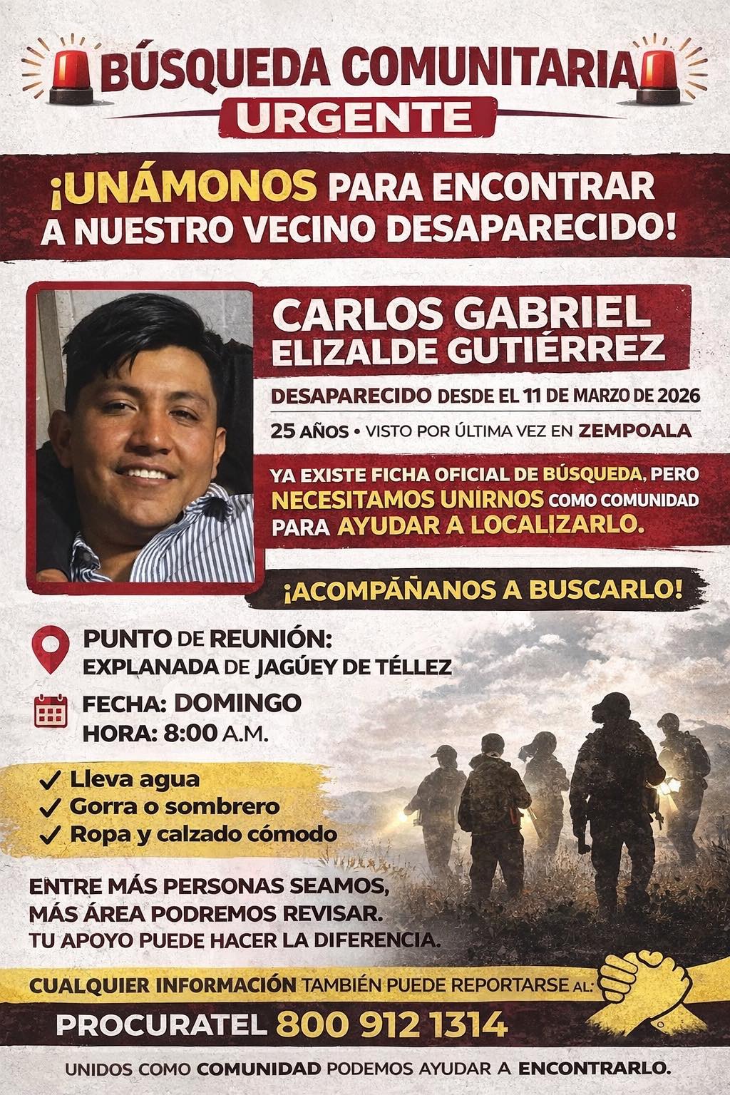 Organizaciones civiles y vecinos de Zempoala, intensifican la búsqueda de Carlos Gabriel Elizalde Gutiérrez de 25 años de edad, por lo que han utilizado drones y binomios.