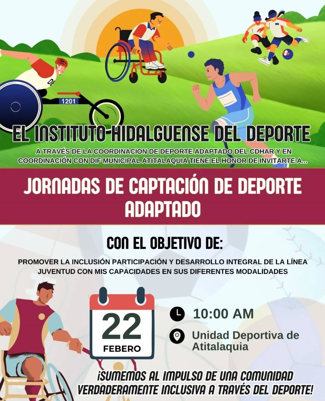 El Instituto Hidalguense del Deporte, a través de la Coordinación de Deporte Adaptado del CDHAR y en coordinación con el DIF Municipal de Atitalaquia, te invita a participar en las Jornadas de Captación de Deporte Adaptado, en la Unidad Deportiva de Atitalaquia (22 de febrero a las 10:00 a. m.).