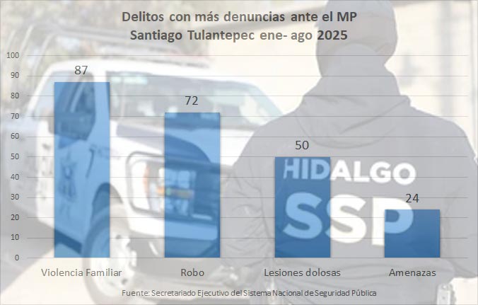 De enero a agosto del presente año, Santiago Tulantepec ha acumulado un total de 398 carpetas de investigación por diferentes delitos, de acuerdo al Secretariado Ejecutivo del Sistema Nacional de Seguridad Pública (SESNSP). Destacan los delitos de violencia familiar, el robo y lesiones dolosas, como los de mayor número de denuncias.