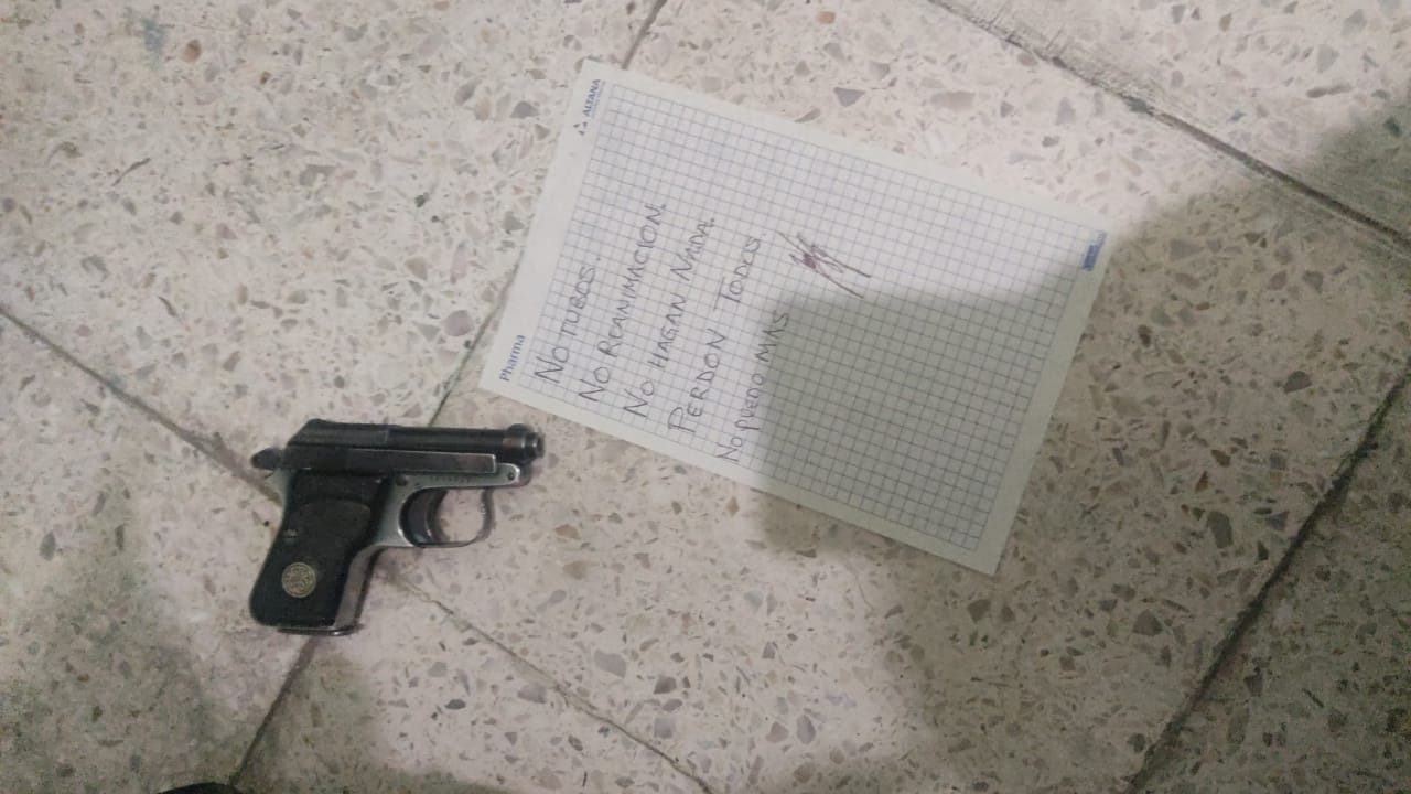 Elementos de la policía municipal y estatal se trasladaron al sitio señalado y al llegar se entrevistaron con quien dio ser hijo de la persona lesionada, refiriéndoles que fue a buscar a su padre, de iniciales J.V.V., y lo localizó con un impacto de bala en su cuerpo y al lado de él, una pistola tipo bereta color negro y una nota que donde se lee “No tubos, no reanimación, no nada, perdón todos no puedo más”.
