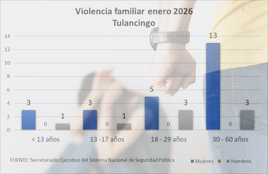 El delito de violencia familiar en Tulancingo tuvo un acumulado de 32 denuncias ante el Ministerio Público, durante el mes de enero, de las cuales, en 24 casos las víctimas fueron del sexo femenino, especialmente en el grupo de 30 a 60 años.