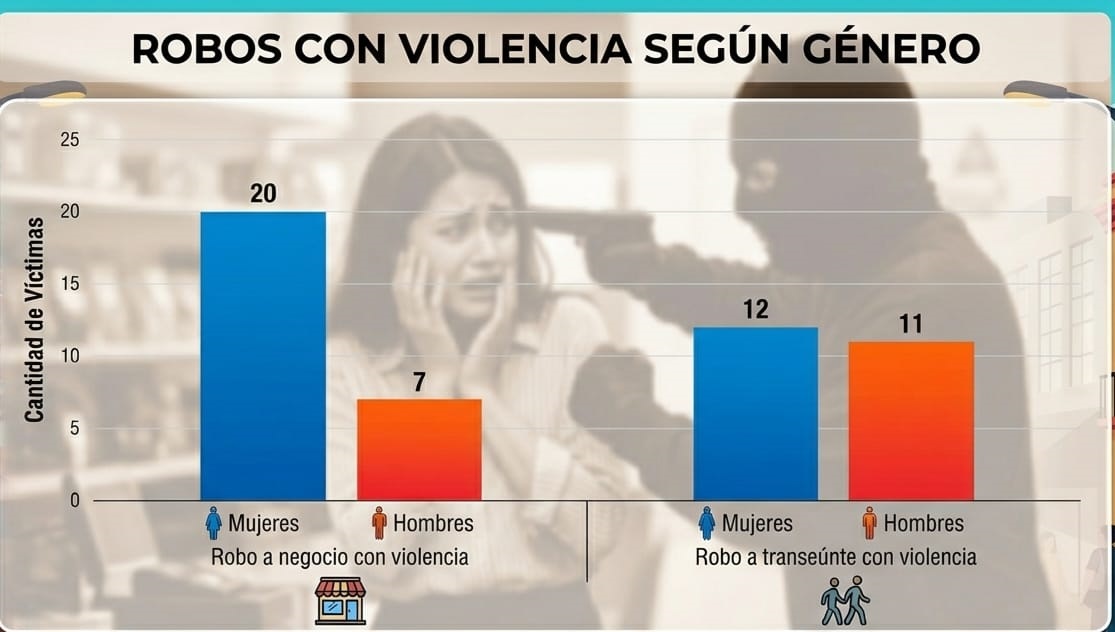 Sin embargo, el desglose de los datos revela matices importantes según la modalidad del crimen. Aunque hombres y mujeres reportaron ser víctimas de robo en 20 ocasiones cada uno bajo ciertos contextos, la brecha se ensancha en los asaltos comerciales violentos, donde las mujeres fueron blanco en 14 incidentes frente a siete casos registrados por varones.