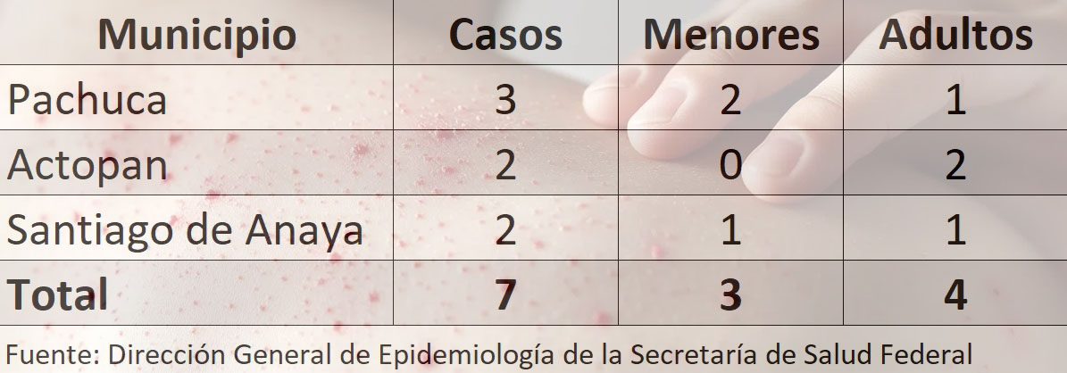 De acuerdo con el informe del brote de sarampión de la Dirección General de Epidemiología de la Secretaría de Salud federal, con corte al 23 de enero, Hidalgo no registra defunciones y mantiene siete casos ubicados en Pachuca, Actopan y Santiago de Anaya.