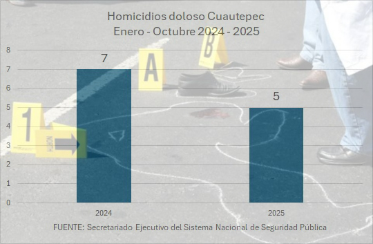 El municipio de Cuautepec de Hinojosa, Hidalgo registra en los primeros 10 meses de la presente administración una baja del 30 por ciento en las denuncias de homicidios dolosos, en comparación al mismo periodo, pero del 2024, de acuerdo a las cifras del Secretariado Ejecutivo del Sistema Nacional de Seguridad Pública (SESNSP), al pasar de siete homicidios a cinco.