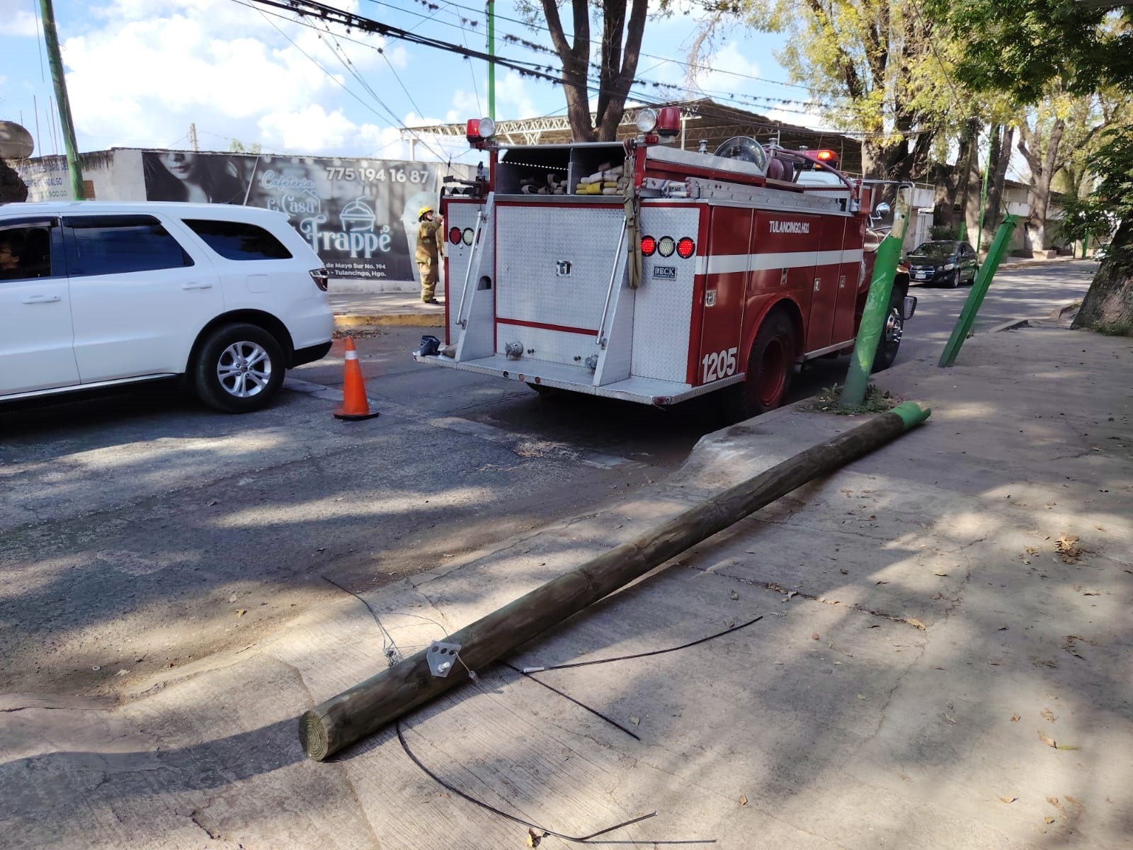 Elementos de Bomberos y Protección Civil de Tulancingo retiraron un poste de madera, propiedad de la empresa Telmex, que al parecer fue impactado por un automóvil y quedó en riesgo de caer, sobre la Calzada 5 de Mayo.