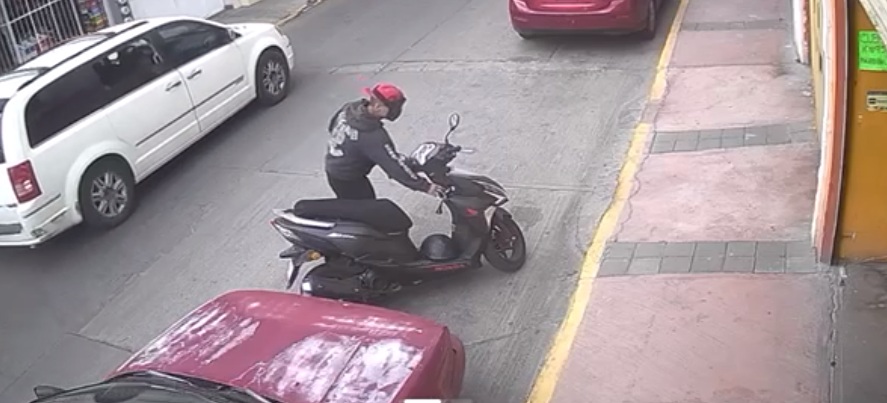 Uno de los sujetos desciende de la moto y camina hacia la motoneta, mientras que el otro continúa su marcha, el primer sujeto se acerca a la moto, observa el panorama y ve que las llaves de la moto están puestas en el switch, por lo que la enciende, la monta y emprende la huida esquivando un microbús y una camioneta color blanco.