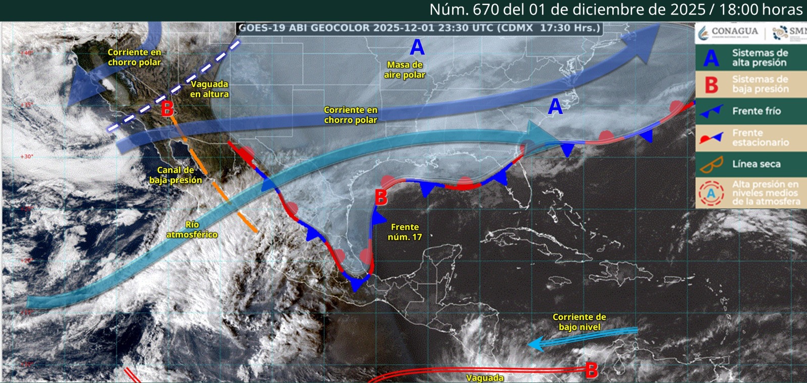 Para diciembre, mes en el que inicia el invierno en el hemisferio norte, se pronostican siete sistemas frontales, cifra que es igual al promedio histórico, y que de completarse al pie de la letra, al término del 2025 estaríamos justo a la mitad de los Frentes Fríos pronosticados, con 24, ya que la temporada tiene el vaticinio de 48 eventos polares.