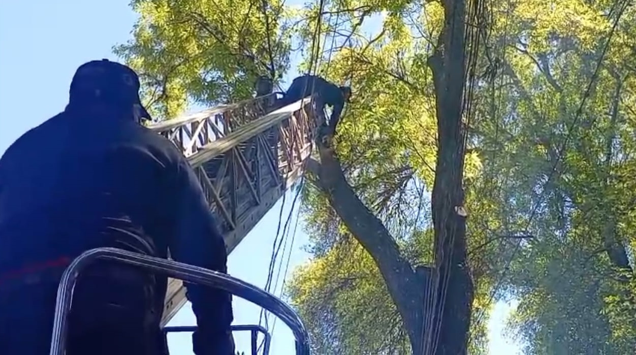 Elementos de la Dirección de Bomberos Protección Civil, así como de Mantenimiento Urbano desafían los 25 metros de altura, para desramar los árboles de la Calzada 5 de Mayo.