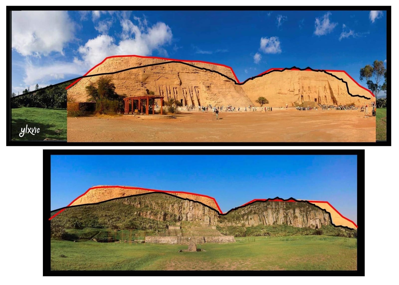 Entre las similitudes están los acantilados del Santuario de Huapalcalco y los Templos de Abu Simbel, que coinciden con los paralelos 20 y 22, latitud norte.