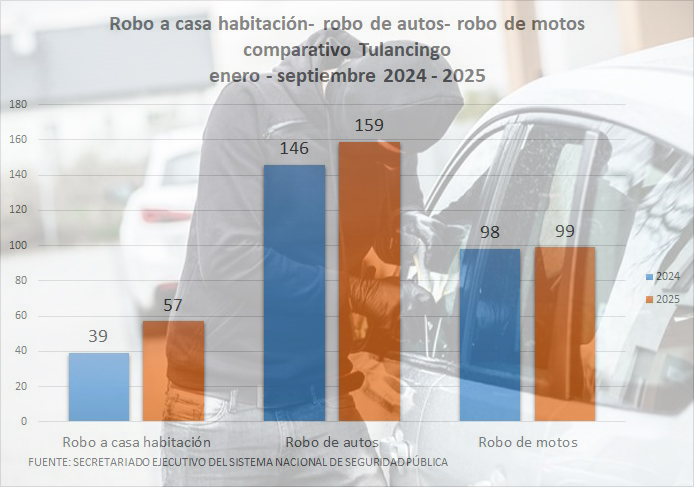 Las denuncias por robo a casa habitación, robo de autos y robo de motos, registran un aumento del 11 por ciento en Tulancingo, en los primeros tres trimestres del 2025 con relación al mismo periodo del 2024, de acuerdo con las cifras del Secretariado Ejecutivo del Sistema Nacional de Seguridad Pública (SESNSP).