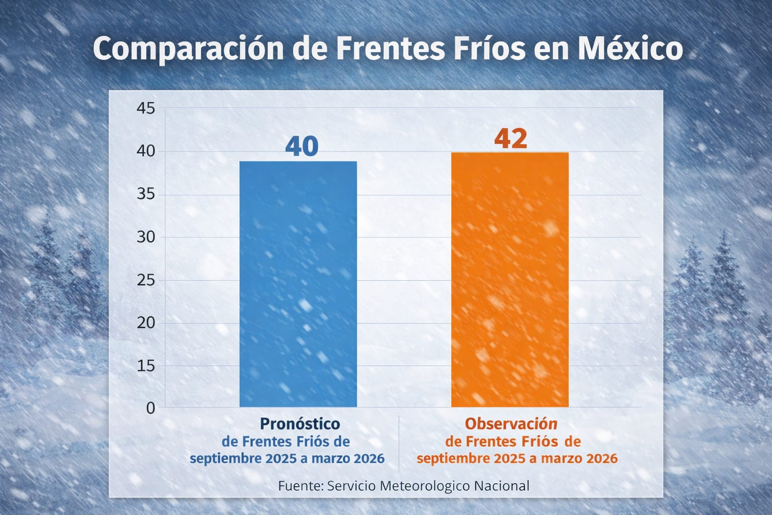 La temporada invernal 2025-2026 ha superado las proyecciones meteorológicas oficiales, pues al cierre de marzo, el Servicio Meteorológico Nacional (SMN) registró 42 frentes fríos, una cifra que supera los 40 sistemas previstos originalmente para dicho periodo.