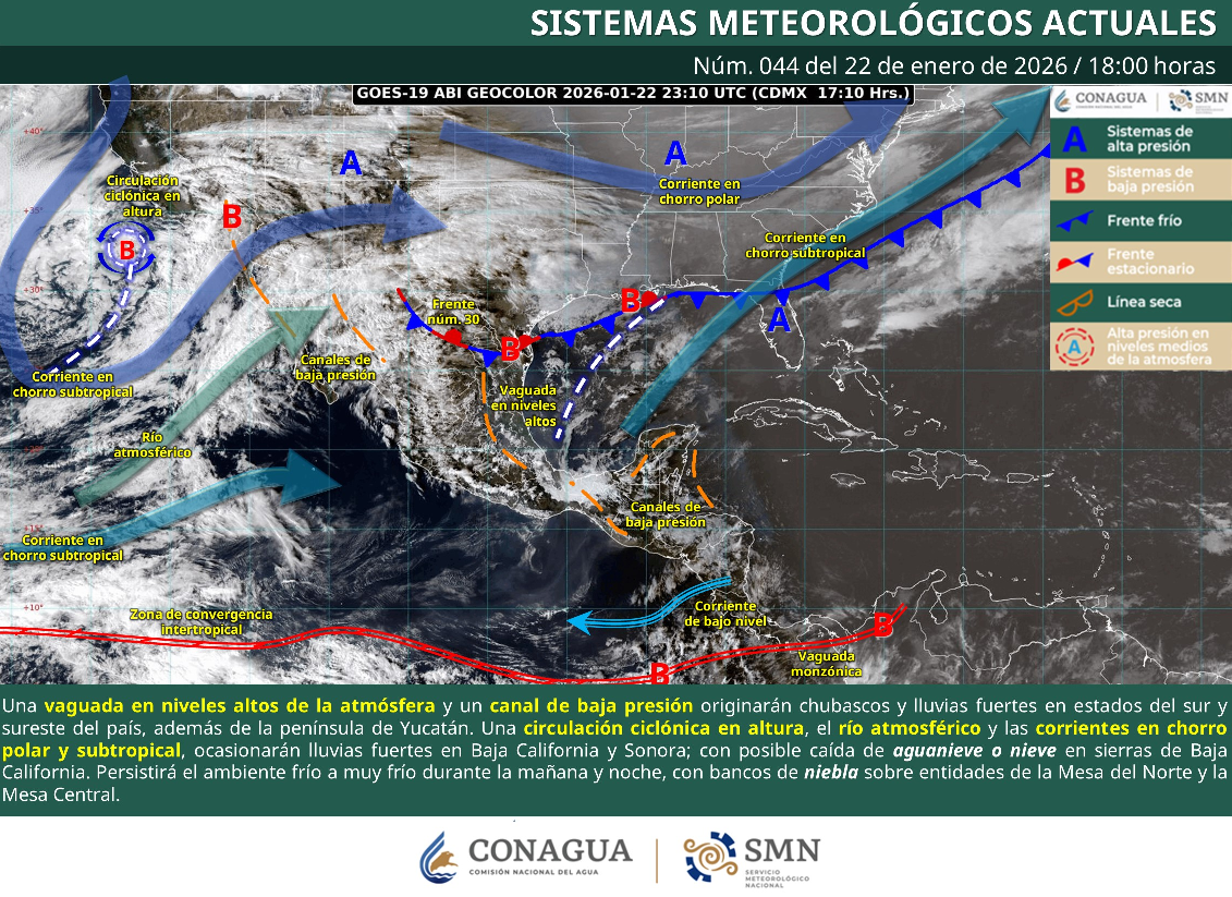Este viernes, de acuerdo a lo informado por el SMN, el Frente Frío 30 será reforzado por una masa de aire ártico y se extenderá sobre la frontera norte de México y en interacción con el ingreso de humedad, generará lluvias y chubascos en el noreste del país; mientras que en estados como San Luis Potosí, Querétaro, Hidalgo, Puebla y Zacatecas, descenso de temperaturas cercanas a los 0 °C en zonas altas.