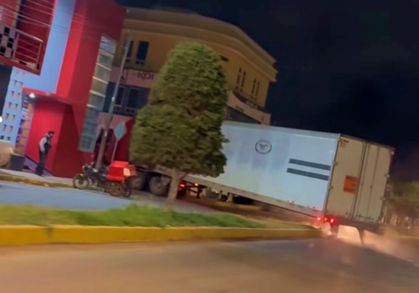 Los hechos ocurrieron ayer (lunes), durante las primeras horas de la madrugada y de acuerdo con información emitida por la Dirección de Movilidad y Transporte, el conductor de la pesada unidad, en primera instancia al dar una vuelta, golpea el semáforo que se ubica frente al referido centro comercial y una parte del remolque se daña.