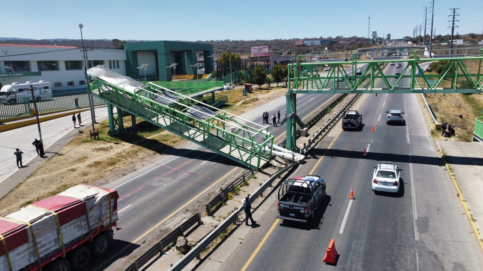 El puente peatonal que fue derribado por un camión grúa con canastillas, la mañana del jueves 26 de marzo, en el corredor vial San José a la altura del Hospital General Tulancingo, será sometido a un peritaje para descartar daños estructurales, y de ser así la próxima semana será recolocado.